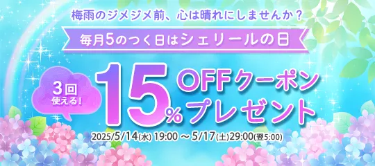 【3回使える!! 15%OFFクーポン配布中✨】毎月5のつく日はシェリールの日≪梅雨前に、心はスッキリ!晴れにしましょう🌞≫